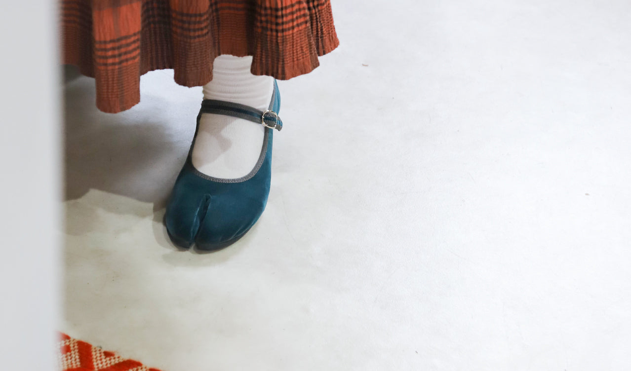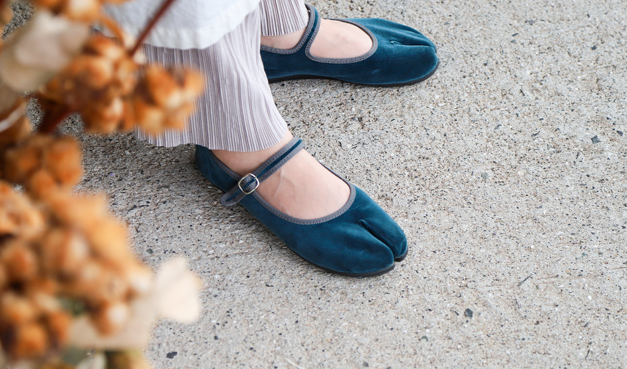 街を歩く、お店を回る、できれば颯爽と、でも大人の女性のかわいらしさも大切にしたい。 ころんと可愛らしいフォルムで、足元を華奢に見せる足袋型フラットシューズ。 ストラップでしっかりホールドされるので、脱げる心配は少なく、スナップボタンで脱ぎ履きもラクチンです。 アッパーは国産別珍の唯一の産地である静岡県磐田市にて、丁寧に織られた生地を採用、ソフトな肌触りと上品な光沢感が特徴です。
