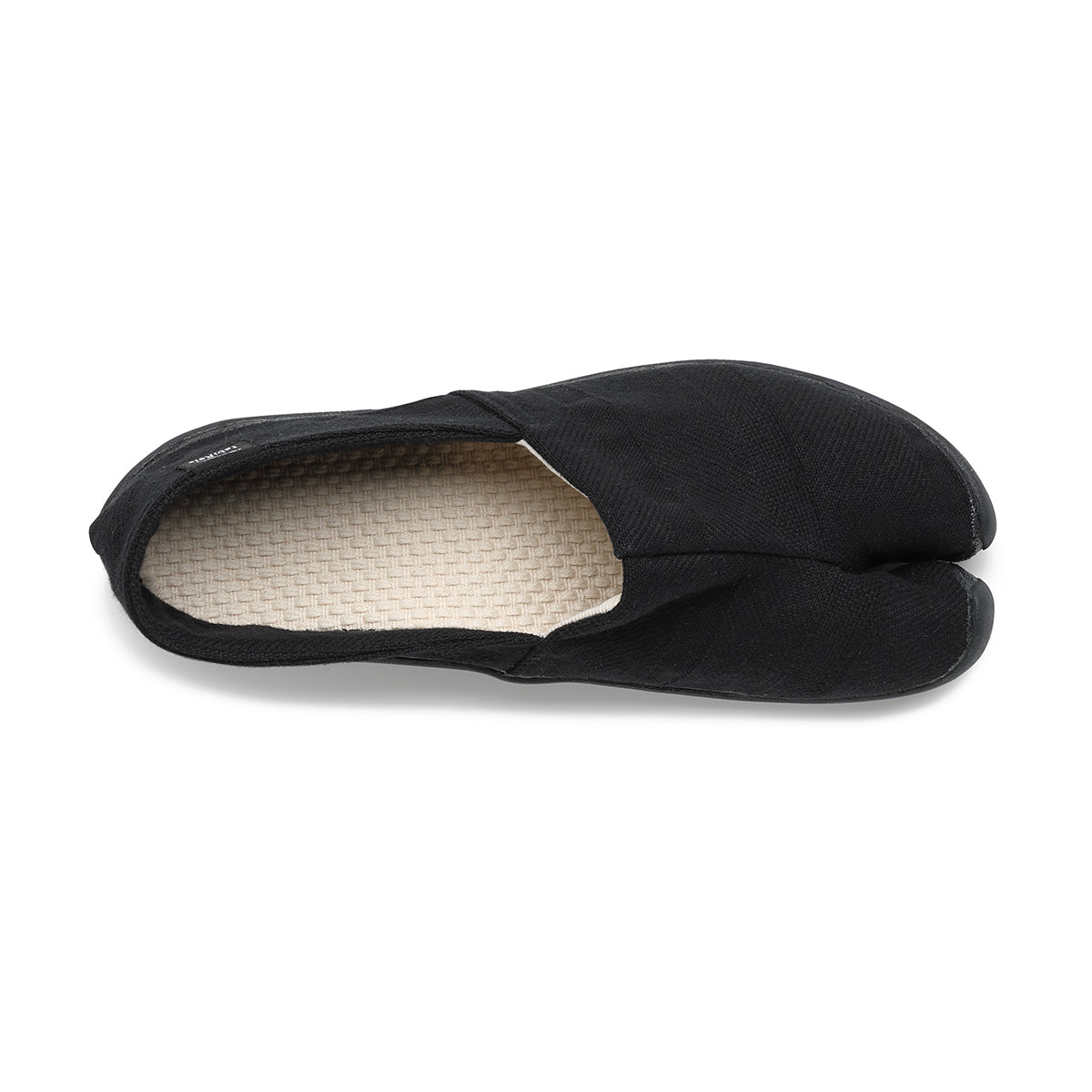 足袋型コンフォートシューズ たびりら。100年の歴史の中で培った足にフィットする足型とこだわりの材料を組み合わせた、履き心地を追求した1足です。アッパーは上質な国産の倉敷帆布を使用、インソールは肌あたりのよい綿100%刺子を使用しています。薄くてやわらかいソールは歩きやすく、はだしのような履き心地を実感できます。